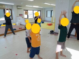 吉田教室では運動遊びの前に準備体操と、模倣力、リズム感を養う目的でリズム体操に取り組んでいます。