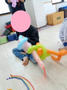 自由時間にお友達が風船を膨らませてバルーンアートに挑戦していました。