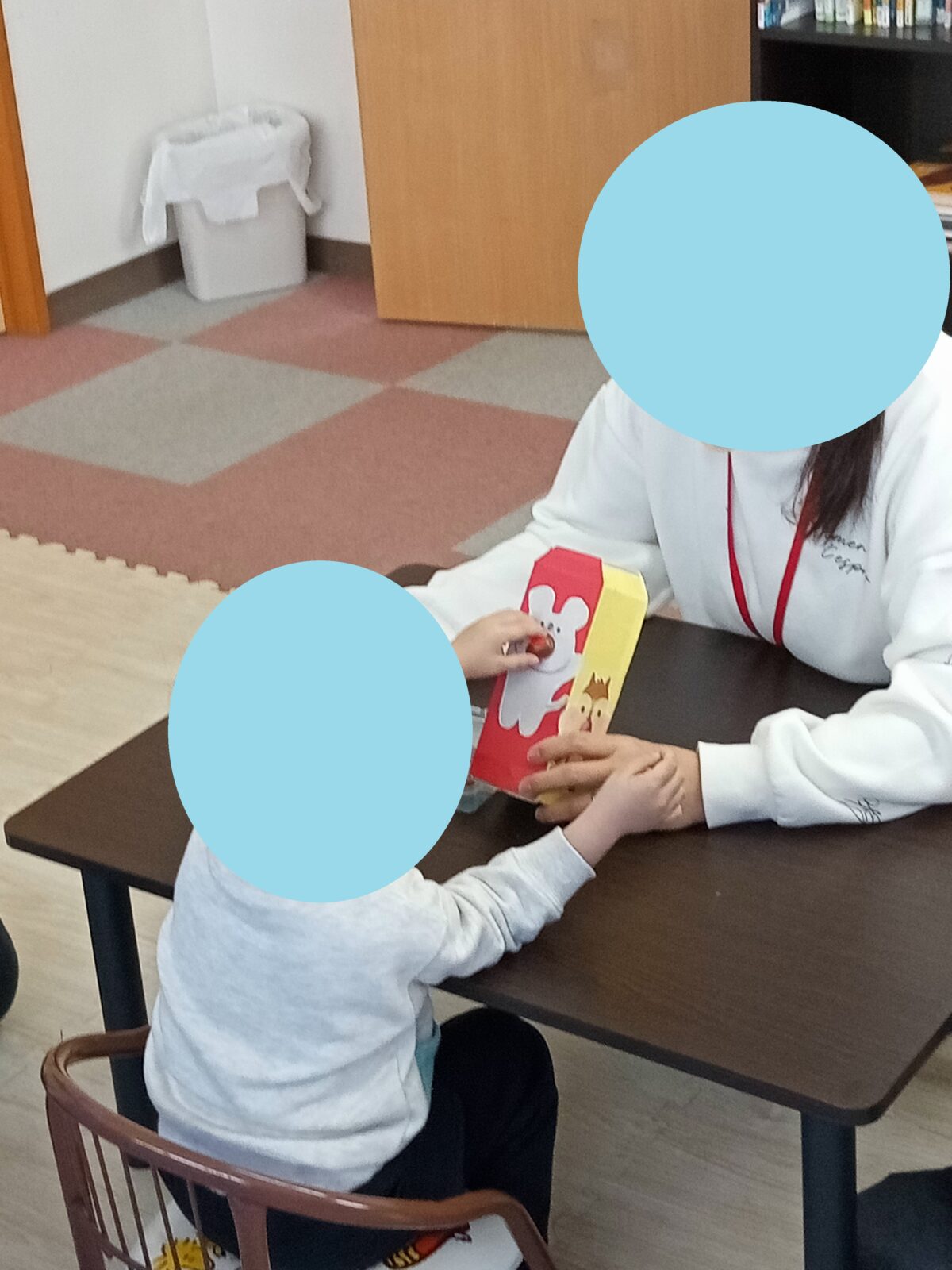 この日はドングリ餌やりをしました。あらかじめドングリに色を付けておき、動物の背景の色とマッチングしてもらいながらドングリの餌やりをしてもらいました。小さい口(穴)の中にドングリを入れるは難しくて時間がかかるかなと思いましが、手先を器用に使って上手に出来ていました!