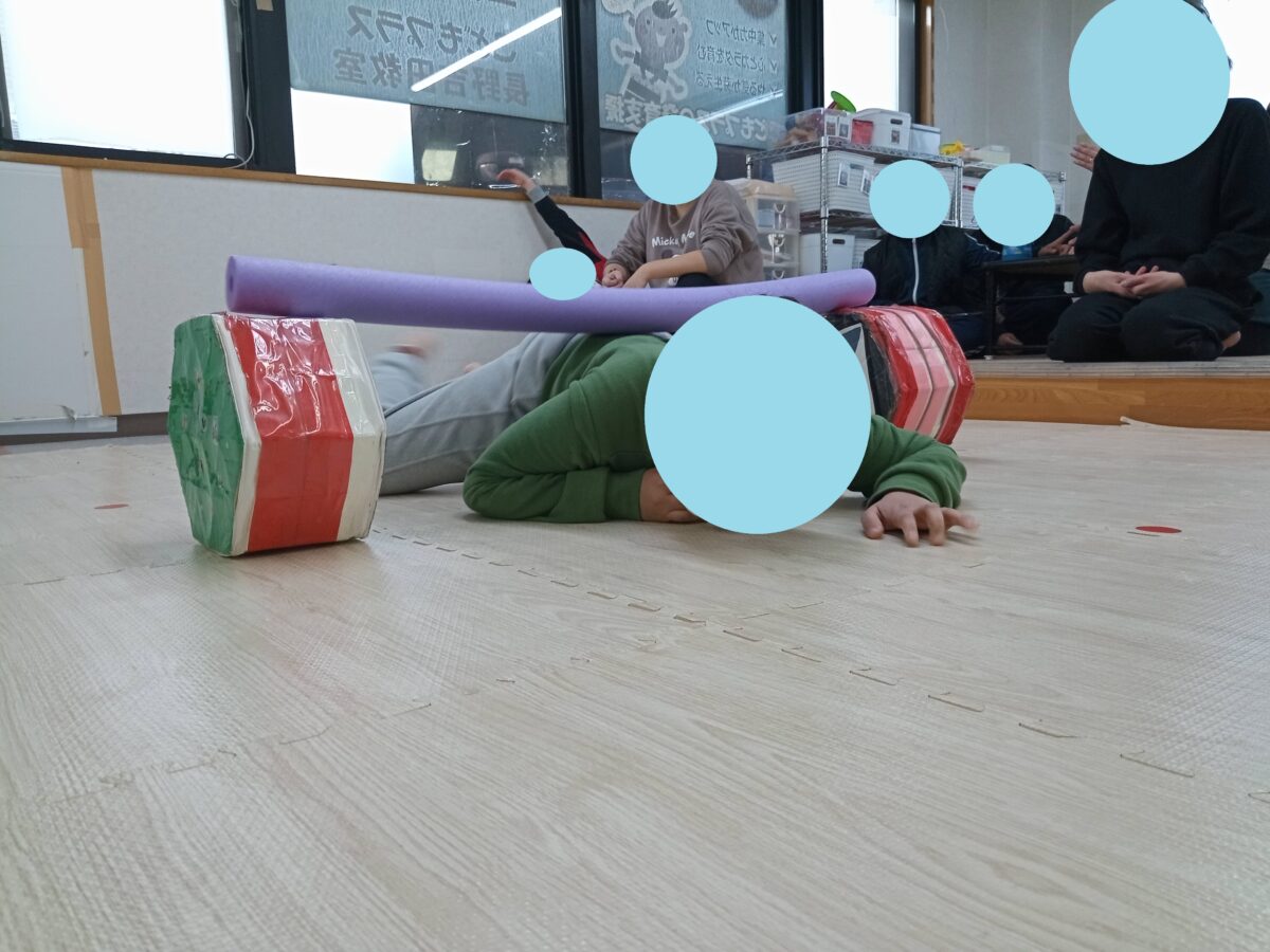 ワニ歩きはスポンジ棒の下を当たらないようにワニ歩きで進みます。